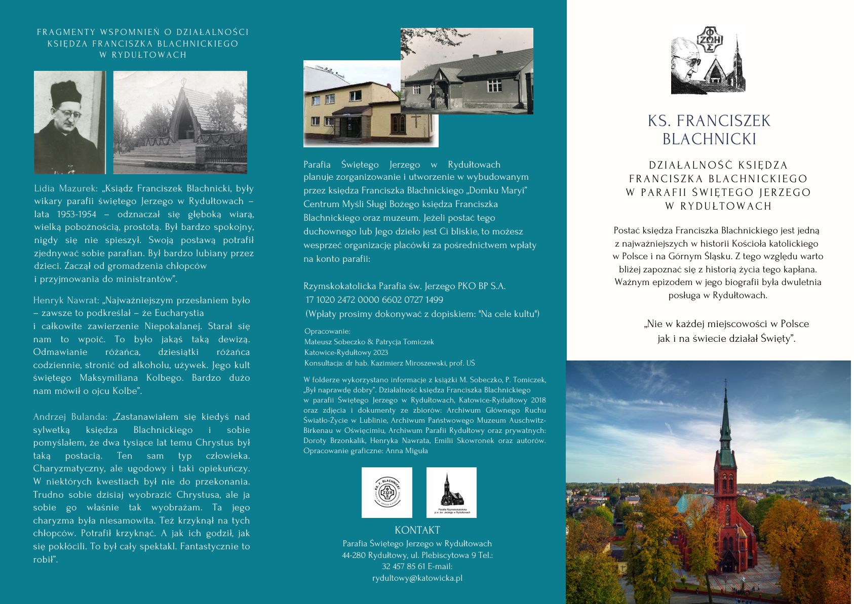 Parafia świętego Jerzego w Rydułtowach planuje zorganizowanie i utworzenie w wybudowanym przez księdza Franciszka Blachnickiego „Domku Maryi” Centrum Myśli Sługi Bożego księdza Franciszka Blachnickiego oraz muzeum. Jeżeli postać tego duchownego lub Jego dzieło jest Ci bliskie, to możesz wesprzeć organizację placówki za pośrednictwem wpłaty na konto parafii: